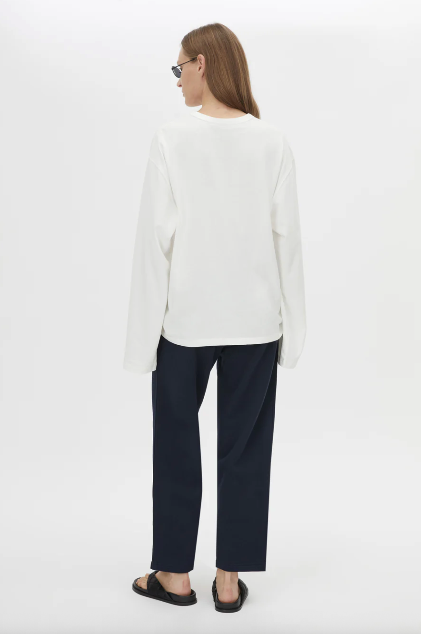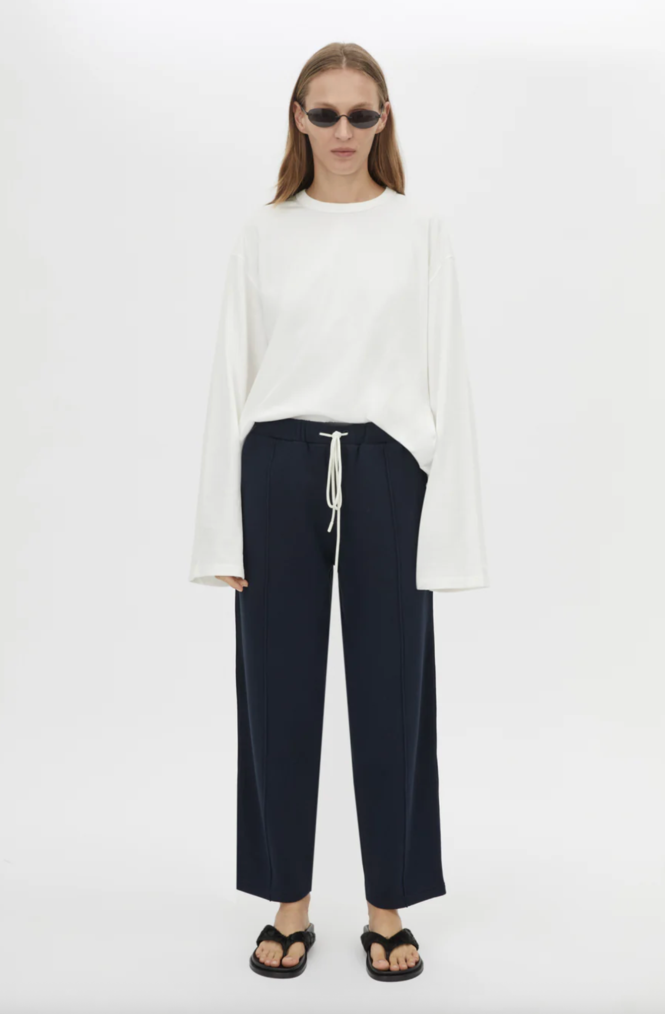 CAMILLA AND MARC Zylus straight-leg, mid-rise cropped elasticated pant in navy/white. Contrast embroidered monogram, side seam piping, centre front pintuck. Atelier Notes: 100% cotton. - Mid-rise, true to size- Model...